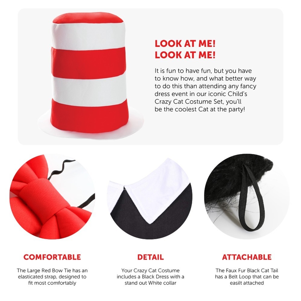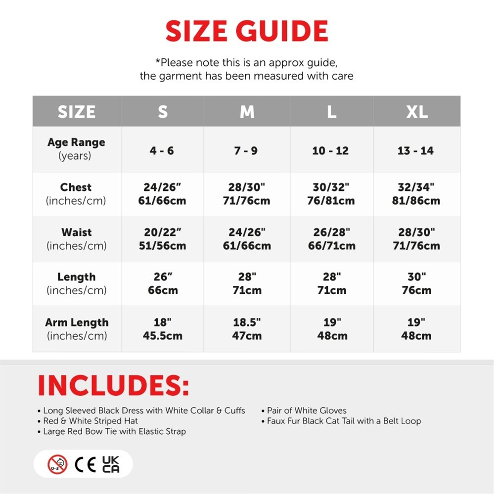 Bring mischievous storybook fun to life with this playful costume inspired by the iconic feline from The Cat in the Hat. Perfect for World Book Day, school events, and fancy dress parties, this bold and instantly recognisable outfit guarantees you’ll be the coolest cat in the room!