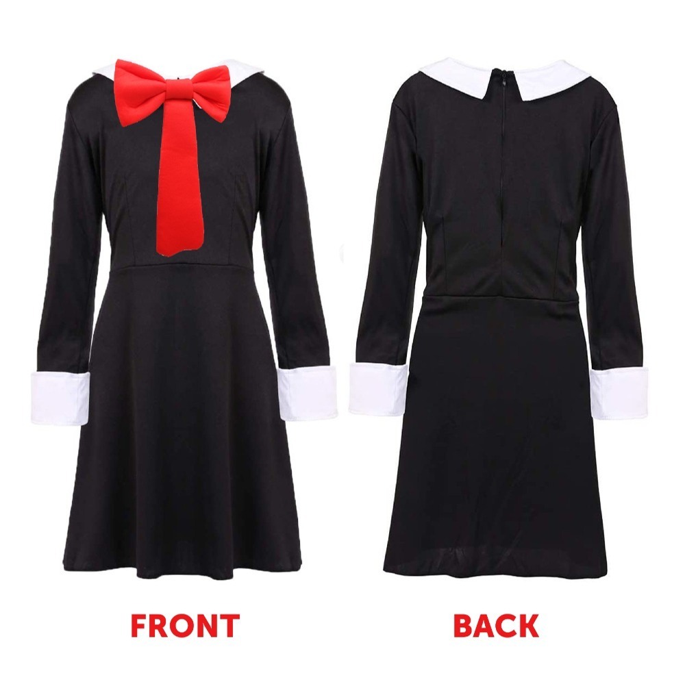 - Black dress with white cuff and collar detail