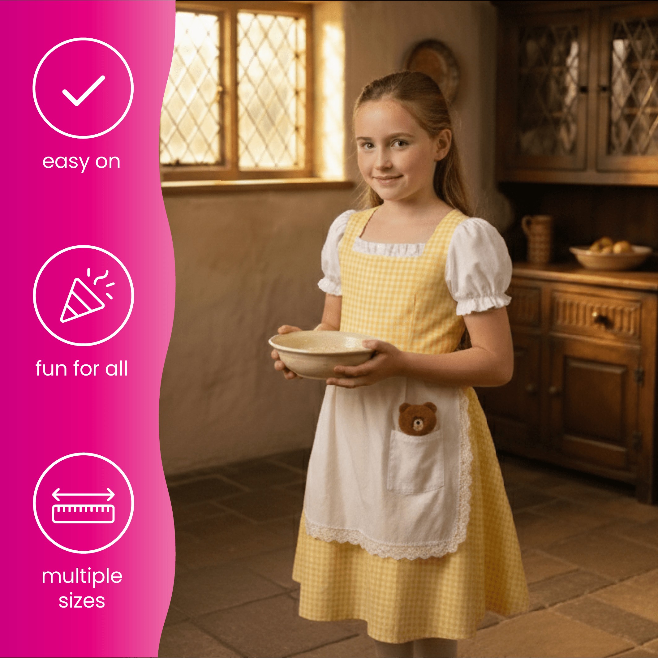 Sweet, classic, and instantly recognisable, the Kids Goldilocks Costume | 3 Pcs | Dress, Soft Basket & Bear is a perfect choice for bringing a favourite fairy tale to life