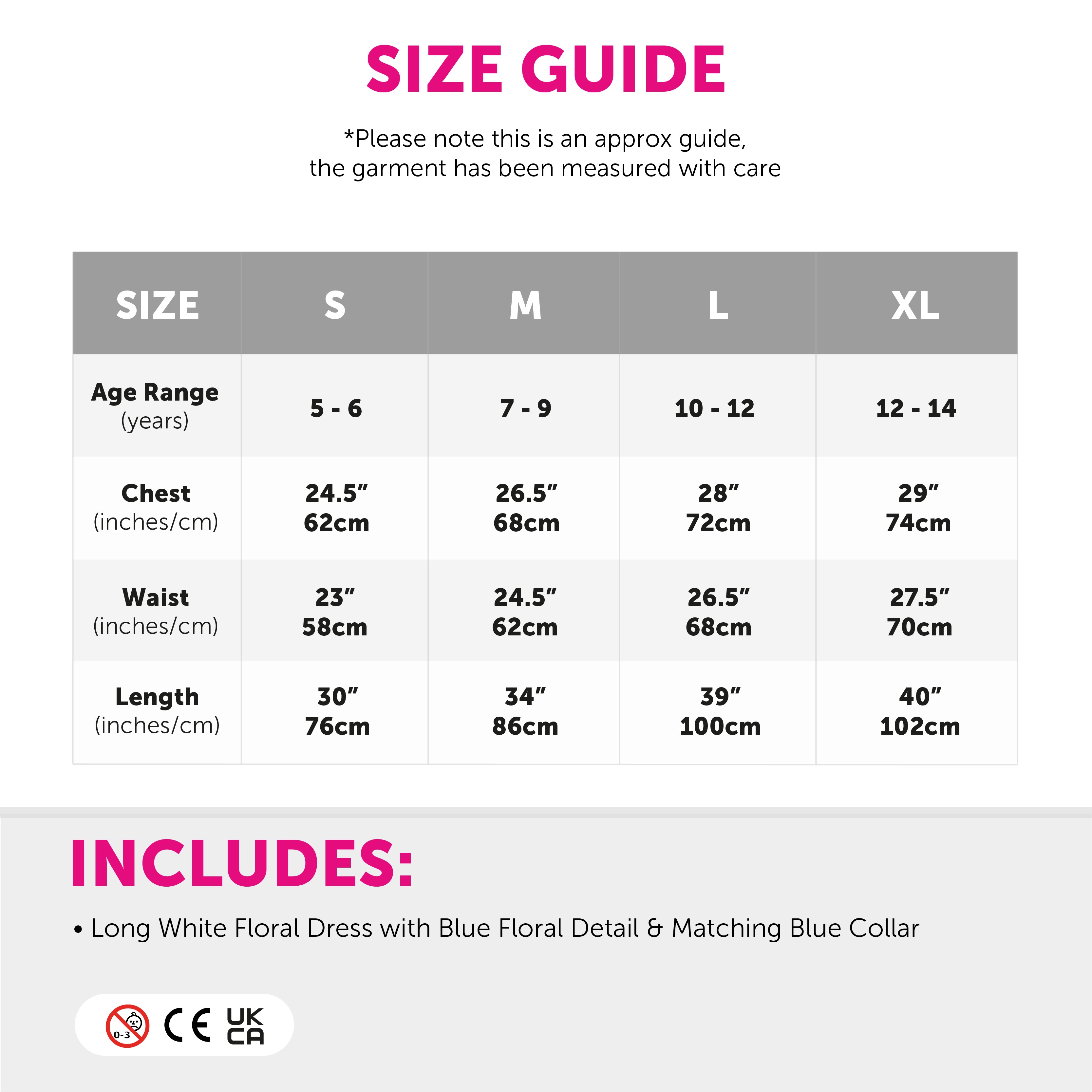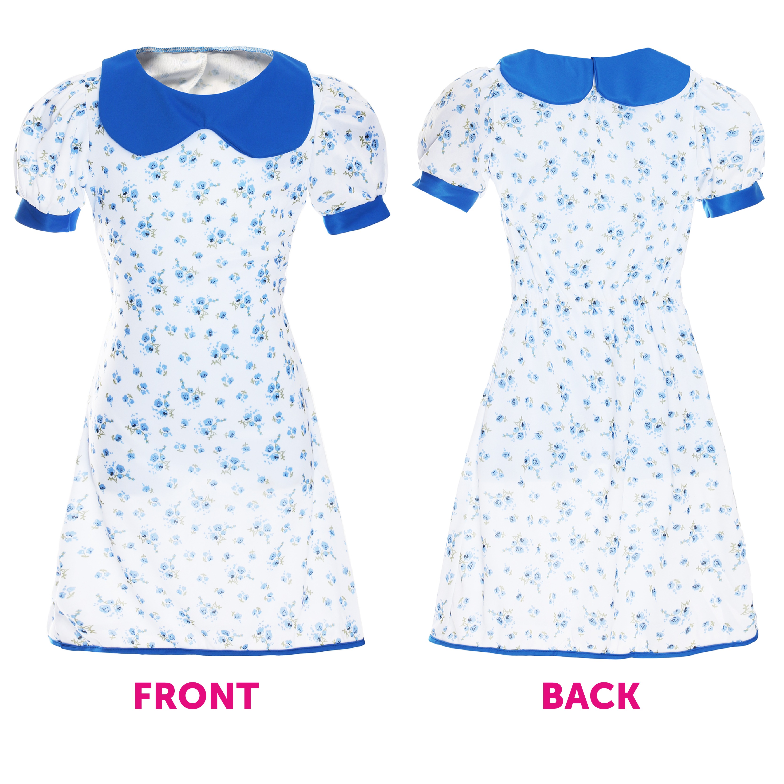 This charming set features a white floral dress with delicate blue flower detailing, a soft blue collar, and blue-edged sleeves for a modest, timeless look. Paired with a neat brown bob wig and round lens glasses, it creates the perfect storybook-inspired teacher appearance.