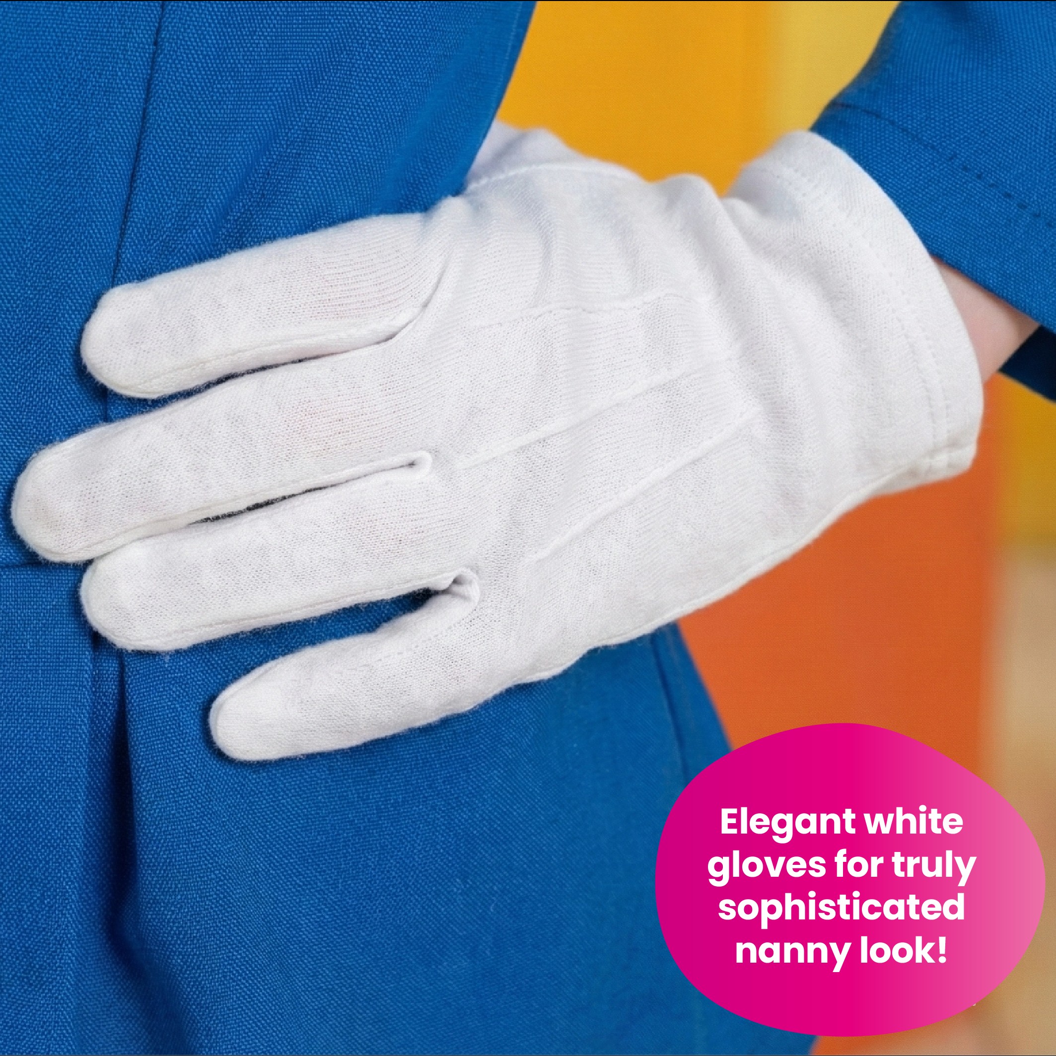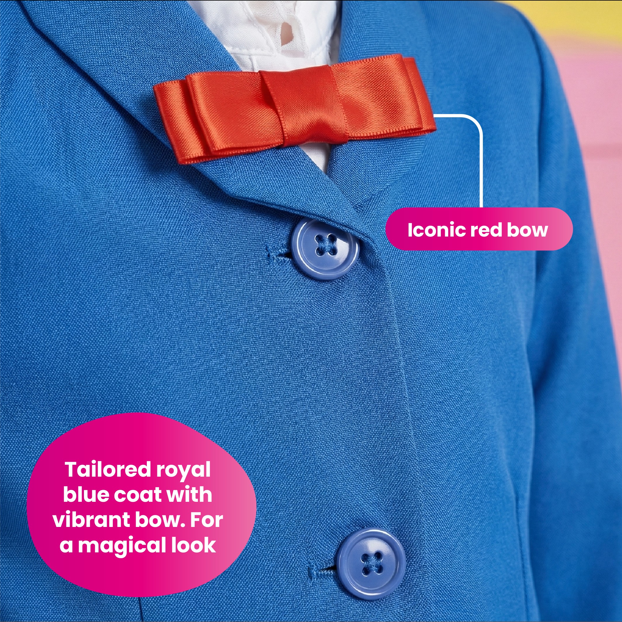 COSTUME SET INCLUDES: The Child's Magical Nanny Costume includes a Royal Blue, easy button up Jacket with an attached White Blouse inside and Red Bow Tie, a matching Long Blue Skirt, a Black Bowler Hat with Daisy Flower detailing, White Gloves, and a large Floral Carpet Bag, the perfect World Book Day Costume!