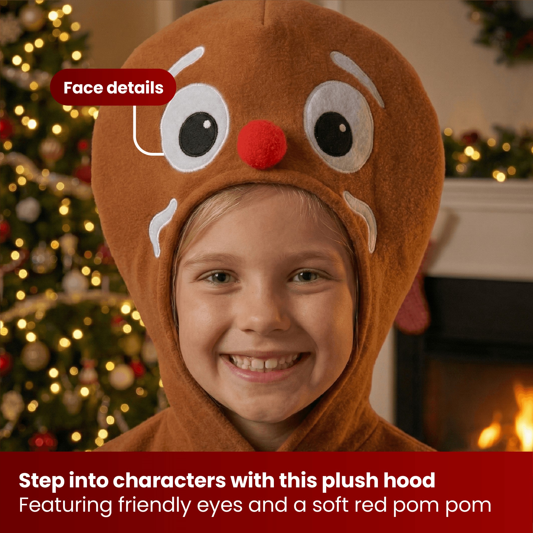 Your Kids Gingerbread Man Costume includes a brown hooded jumper with a smiling gingerbread face, colourful button detailing, and white icing-style trim for that freshly baked look. It also comes with matching brown trousers, creating a full, adorable festive outfit that’s easy to wear and perfect for all kinds of Christmas fun.