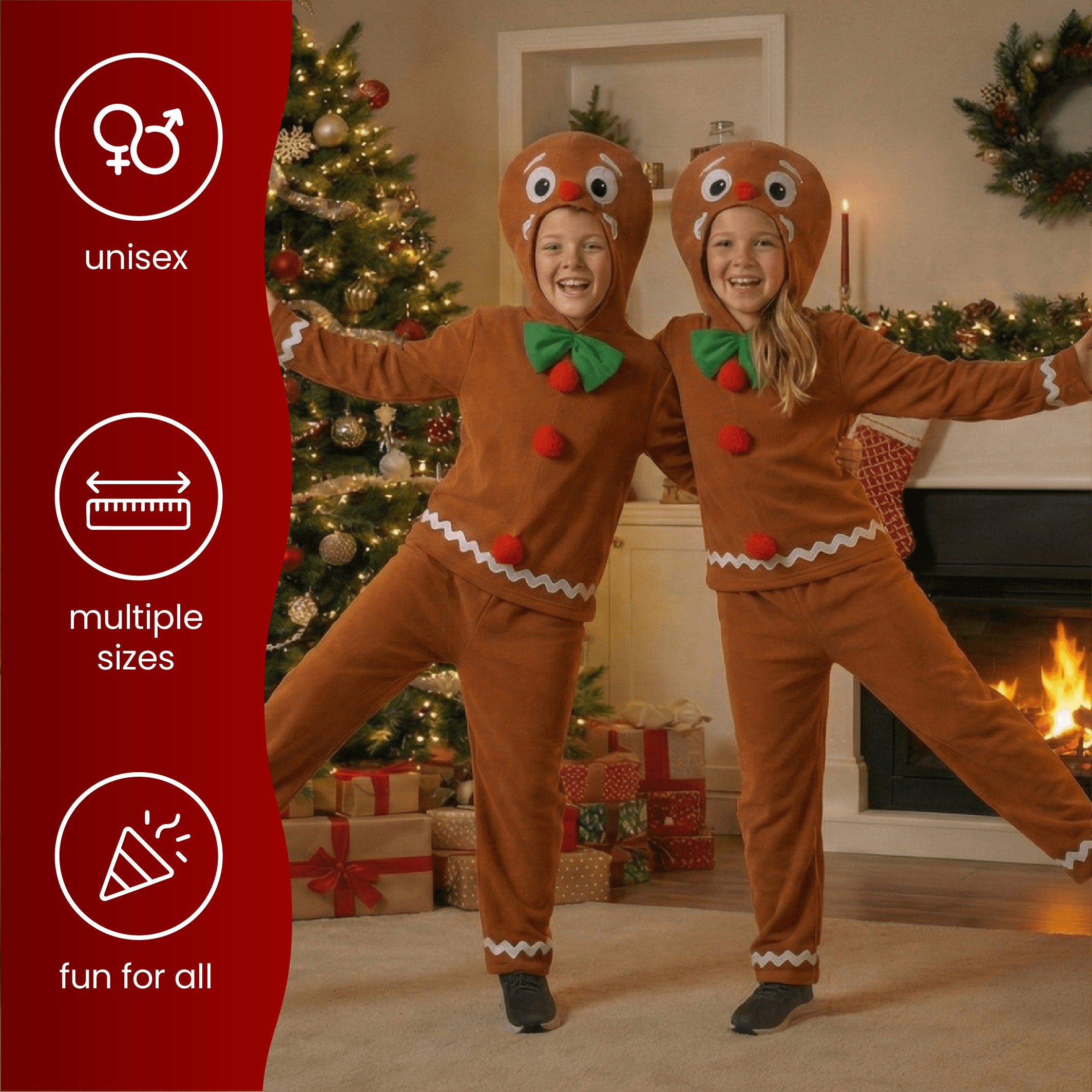 Let your little one join in the Christmas fun with our Kids Gingerbread Man Costume, a sweet and festive outfit perfect for school plays, parties, and family celebrations. Just like the grown-up version, this two-piece costume captures all the cheerful charm of everyone’s favourite Christmas treat!
