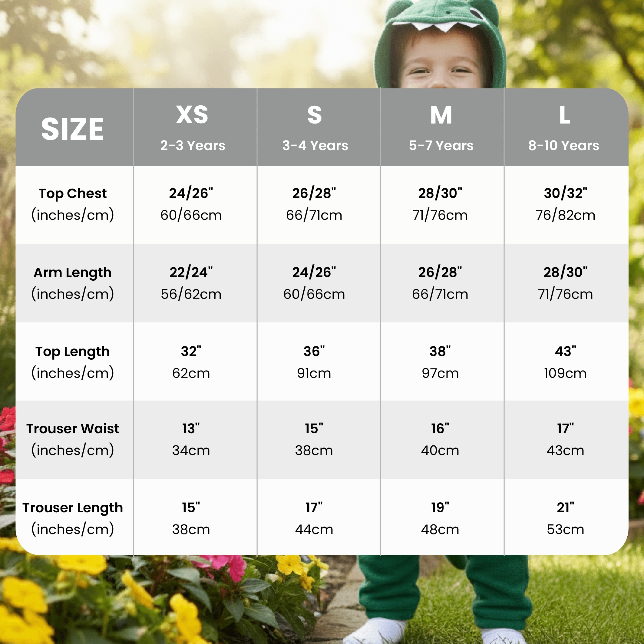 This Kids Green Dinosaur Onesie is available in the following sizes: