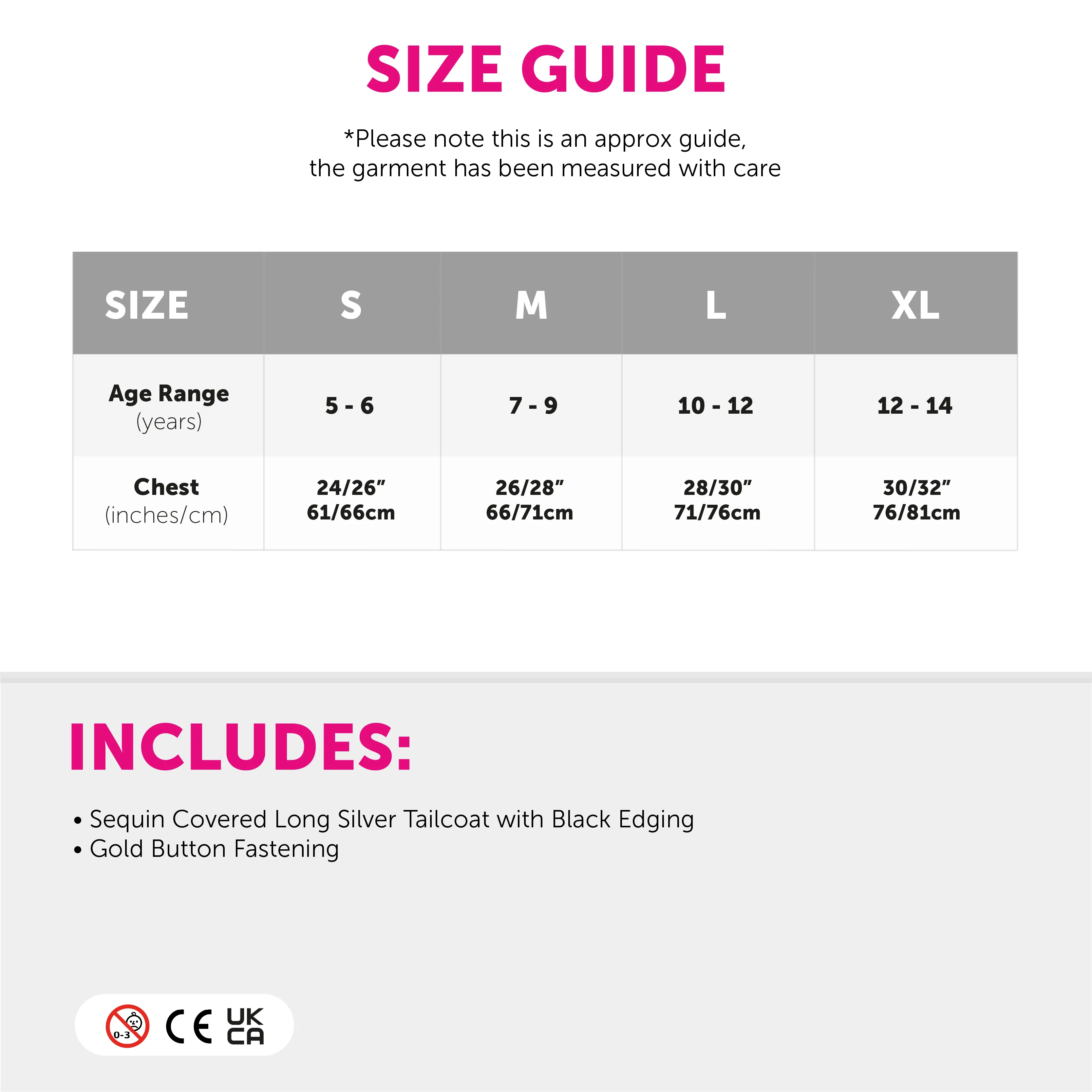 The standout silver sequin tailcoat features black edging and a gold button detail, adding sparkle and style to the outfit. Paired with a long black cape with easy hook and loop fastening, it creates a dramatic and theatrical look.