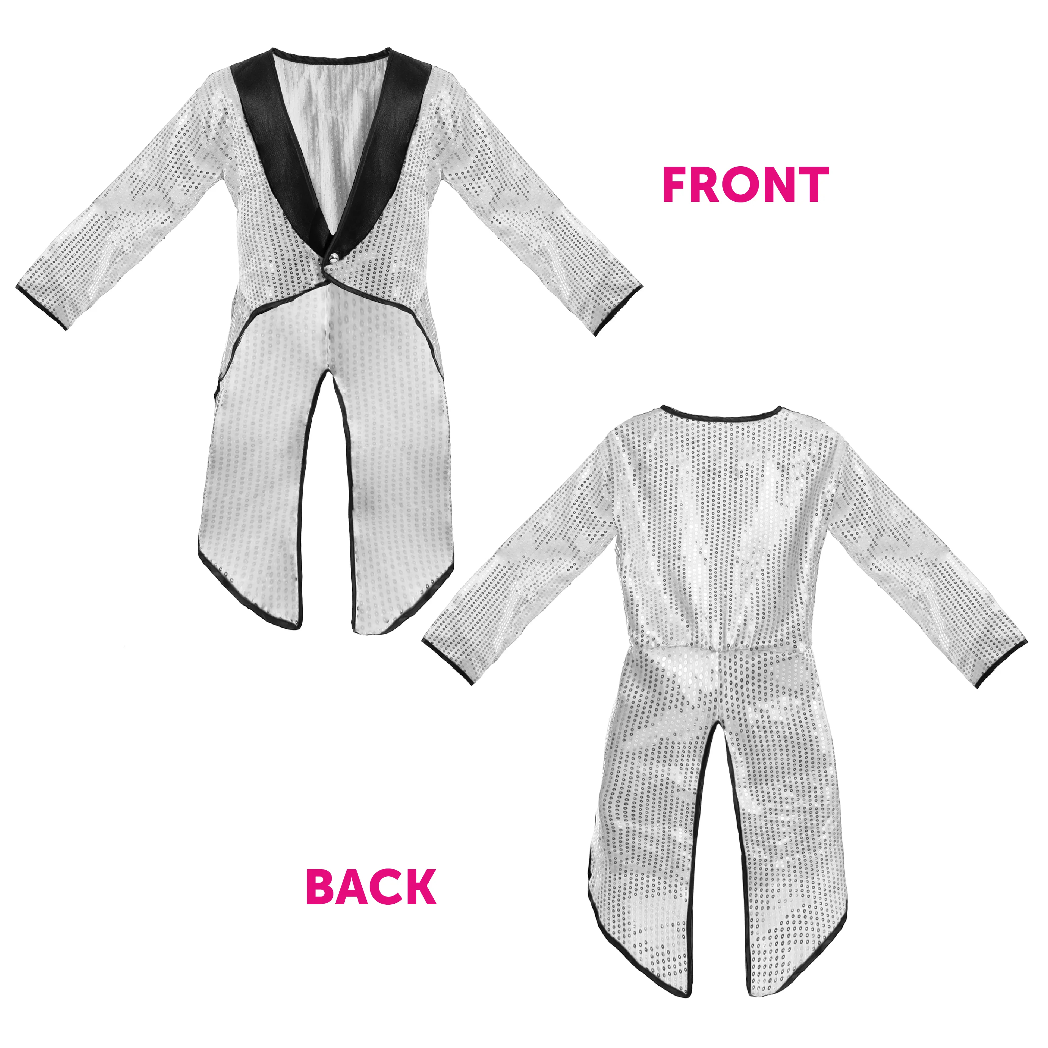 - Includes silver sequin tailcoat with black edging and gold button