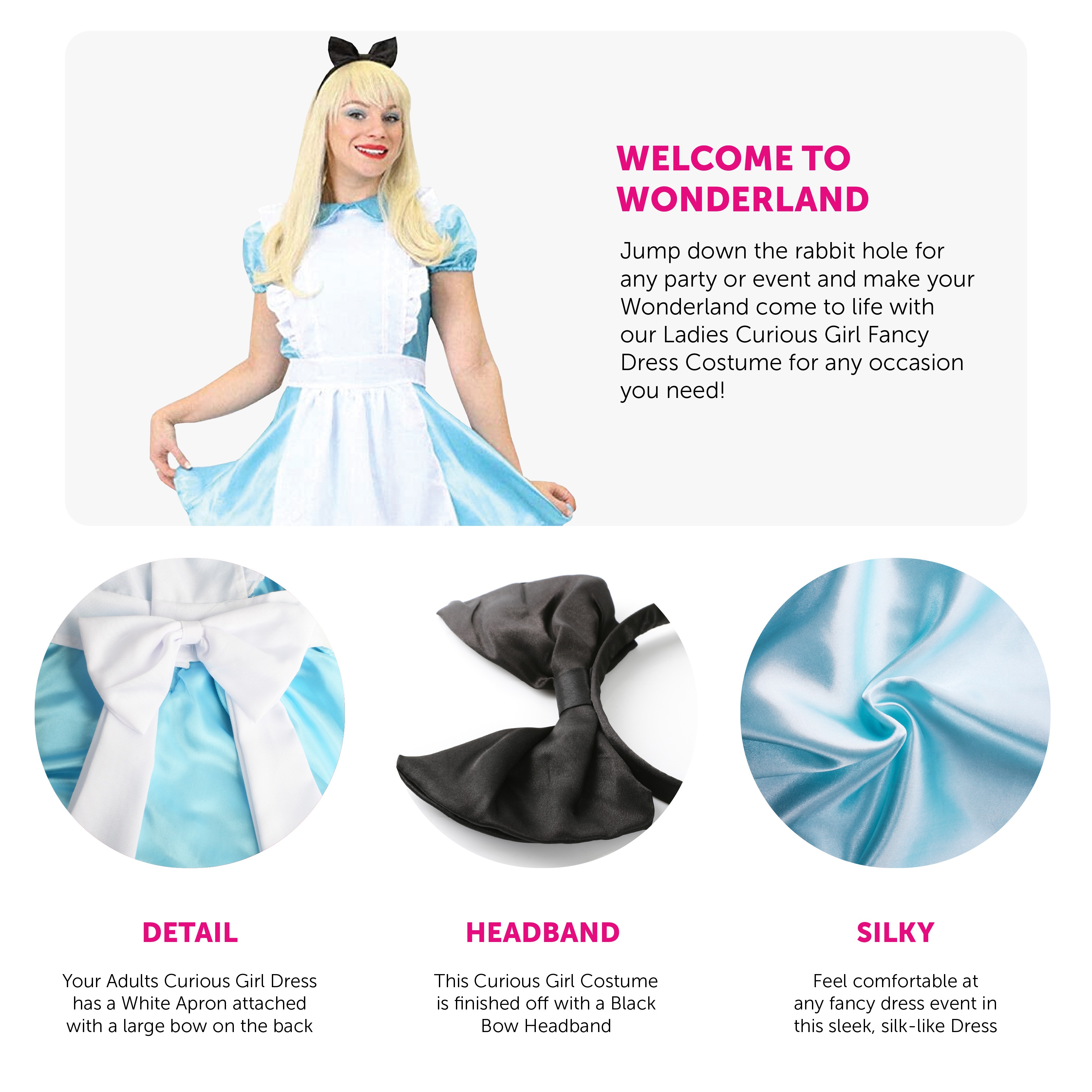 Jump down the rabbit hole for any party or event and make your Wonderland come to life with our Ladies Curious Girl Costume for any occasion you need! Inspired by the classic tale of Alice's Adventures in Wonderland, this timeless outfit is perfect for World Book Day, themed parties, and fancy dress events.