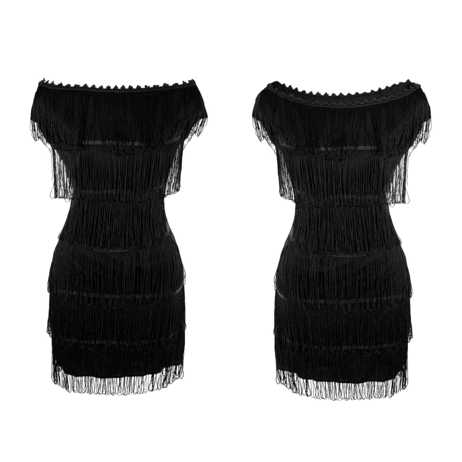 The black dress features stylish fringing detail on the front, adding movement and dramatic flair to your outfit. Designed for comfort and statement styling, it pairs perfectly with the coordinating accessories.