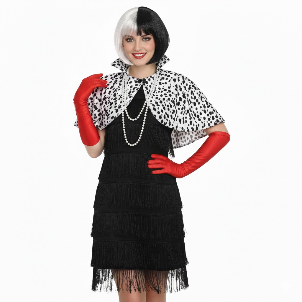 Step into the spotlight and embrace full villain glamour with this striking 5-piece costume set inspired by the legendary fashion-obsessed antagonist from 101 Dalmatians. Perfect for World Book Day, themed parties, and dramatic fancy dress moments, this complete outfit is designed to make a bold and unforgettable entrance.