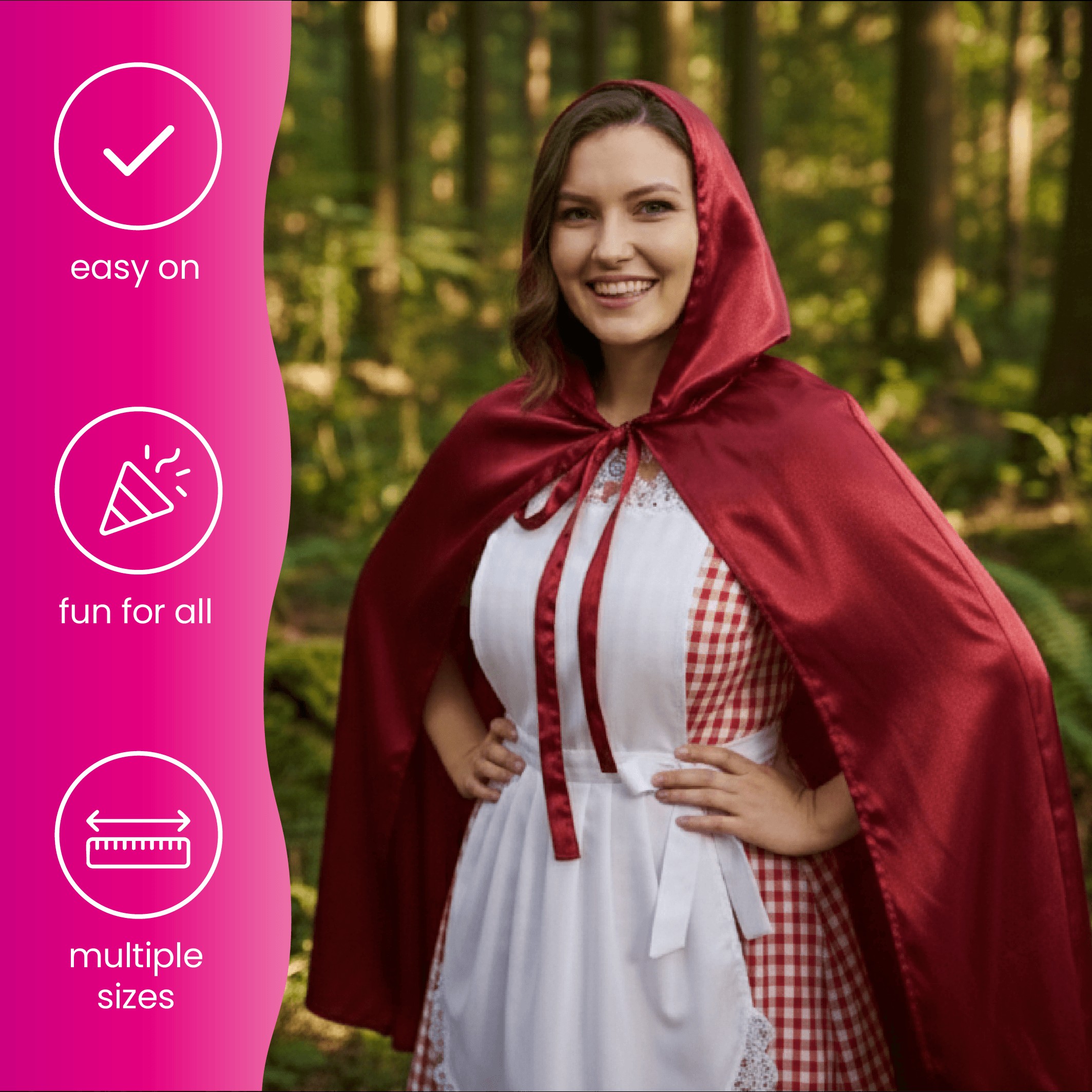 This charming Red Riding Hood Costume features a long red cape with an attached hood and easy tie-up fastening, paired with a classic red and white gingham-style dress complete with an attached white apron. Available in sizes X-Small to XX-Large, ensuring a comfortable and flattering fit for a wide range of wearers.