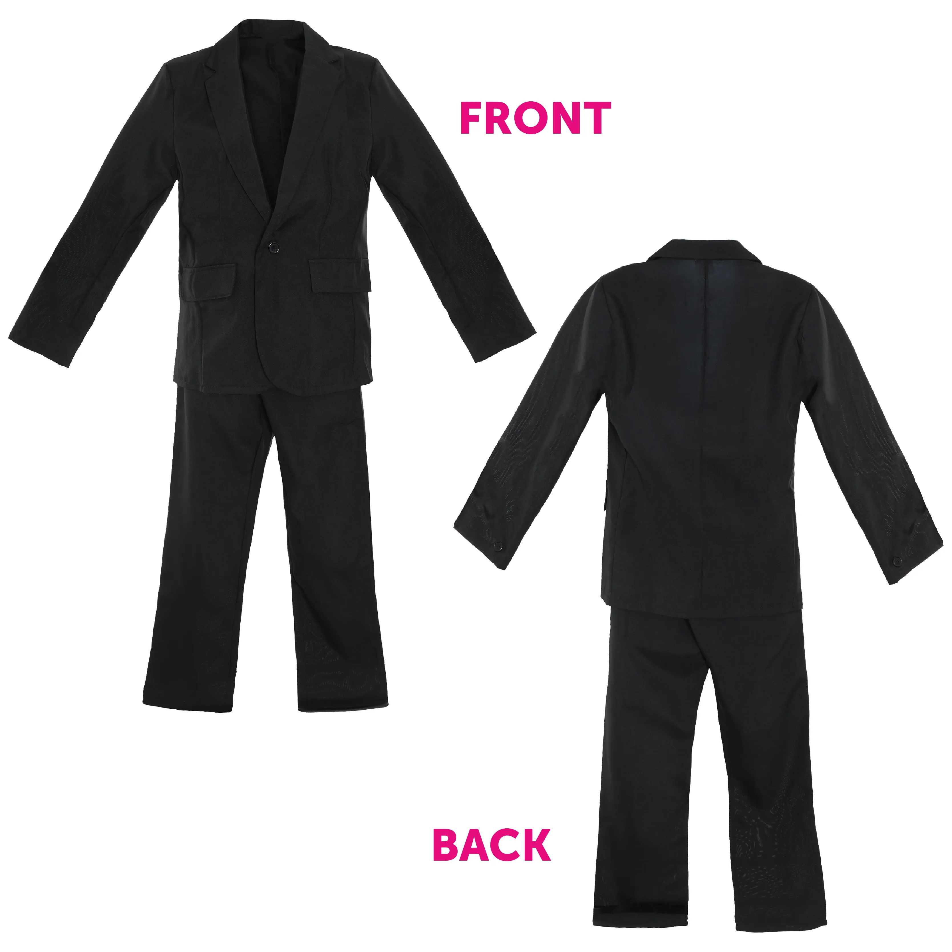 The costume includes a two-piece black suit with a smart blazer and matching trousers, featuring a button fastening and elasticated waistband for a comfortable fit. Pair it with the included black tie, which is fully adjustable to suit your style.